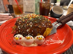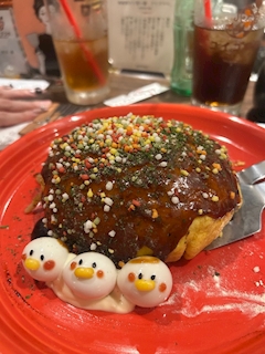 お好み焼き💭 めっちゃオシャレ✨ 味はガッツリ粉もんで 好みな感じだった💭 ピヨちゃんず可愛い🐥⸒⸒ お店の人が 電動ノコギリで 切り分けてくれるんだけど🤔 ピヨちゃんが危ないということで 救出してました モヒカン?🤔 👋