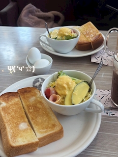 昨日りのちとモーニング行った!😴🩵 めーっちゃおいしかった💭💭💭🎶 家入れなくなっちゃって泊めてもらいました(இωஇ`。) ありがとう救世主すぎる。°(°¯᷄◠¯᷅°)°。