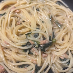 虚無ご飯🍝 ツナとほうれん草のパスタ🍝 醤油バターで 味をつけました👍 大好きな醤油バター 調子にのって 2人前くらいの パスタを湯掻いちゃって さすがにきつかった😃 でも美味しかったー‼️ ツナでパスタも ありだな💭 ツナ缶はストック してるので 色々冒険してみよう💭 👋
