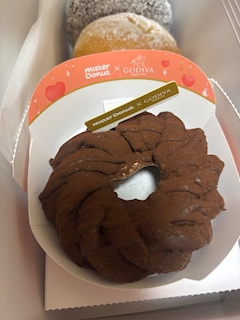 本日21時より出勤です🍀 ママと買い物してるとき 🗣️「ミスド食べたい」って 言われたので いいじゃーんと思って ミスドにふらっと寄りました🙂↕️ そういえば、、 GODIVAコラボ🍫 やってたなと 思い出して購入✌️ キャラメル美味しい🤤 甘すぎないし ビターなココアパウダー??が 美味しくて 満足です🫶 たまにはガッツリ 甘いものもいいね (調子に乗って) (エンゼルクリーム買ったけど) (少しで満足したので) (ママにあげました👍) 👋